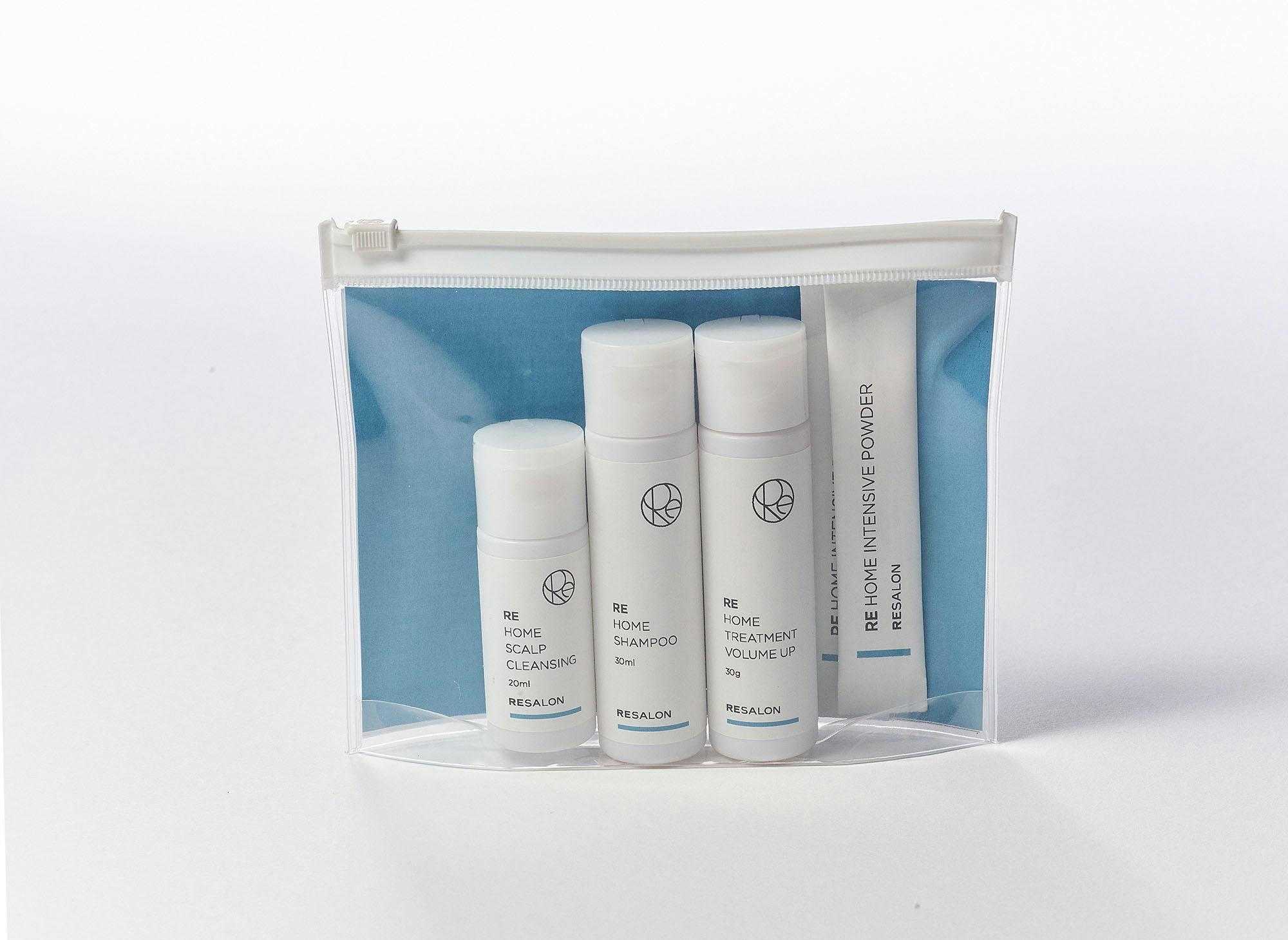 RE HOME CAREの「RE HOME SCALP CLEANSING」「RE HOME SHAMPOO」「RE HOME TREATMENT」に、「RE HOME INTENSIVE POWDER」が2本付いた、約5日分のトラベルセットです。