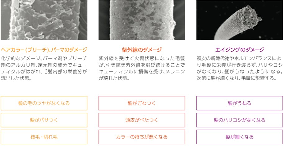 髪のお悩みの原因は、ヘアカラー(ブリーチ)、パーマによるダメージ、紫外線によるダメージ、エイジングによるダメージなどがあげられますが、これらの長年蓄積したダメージと年齢によるダメージを従来の一般的なトリートメントやサロンで何度もケアしても、それは一時しのぎにすぎません!