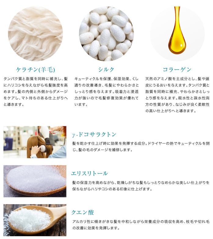 ・クエン酸:アルカリ性に傾きがちな髪を中和しながら弱酸性に保ち、栄養成分の吸収を高めます。