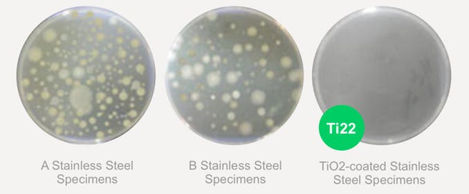 チタンは空気に触れると、チタン原子の非常に薄い層が酸素と相互作用して、酸化チタン(IV)またはチタニアとしても知られるTiO 2(二酸化チタン)のナノコーティングを生成します。このチタニア(TiO 2)には、細菌の繁殖を防ぐ強力な抗菌効果があります。
