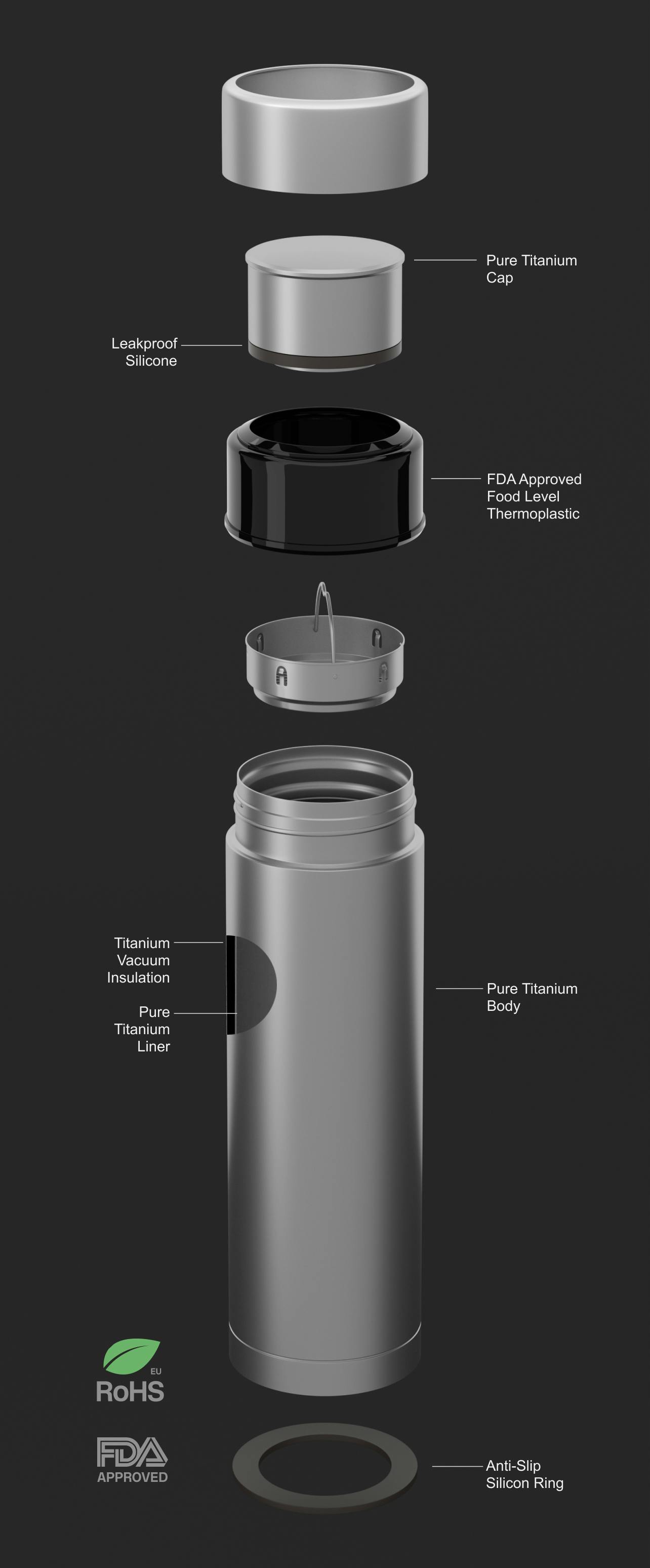 しかし、Thingyfy社のTi22チームは、何年も研究開発に取り組んだ末、遂に「True Vacuum™」と呼ばれる技術を開発しました。これは、純粋な真空環境(10-3パスカル以下)で継ぎ目のない二重層のチタンシリンダーを直接鍛造する技術で、真空サーモボトルを製造する上で飛躍的な進歩となりました。 その結果、エレガントな外見と高い耐久性を備えた製品をお求めやすい価格で提供することが可能になりました。