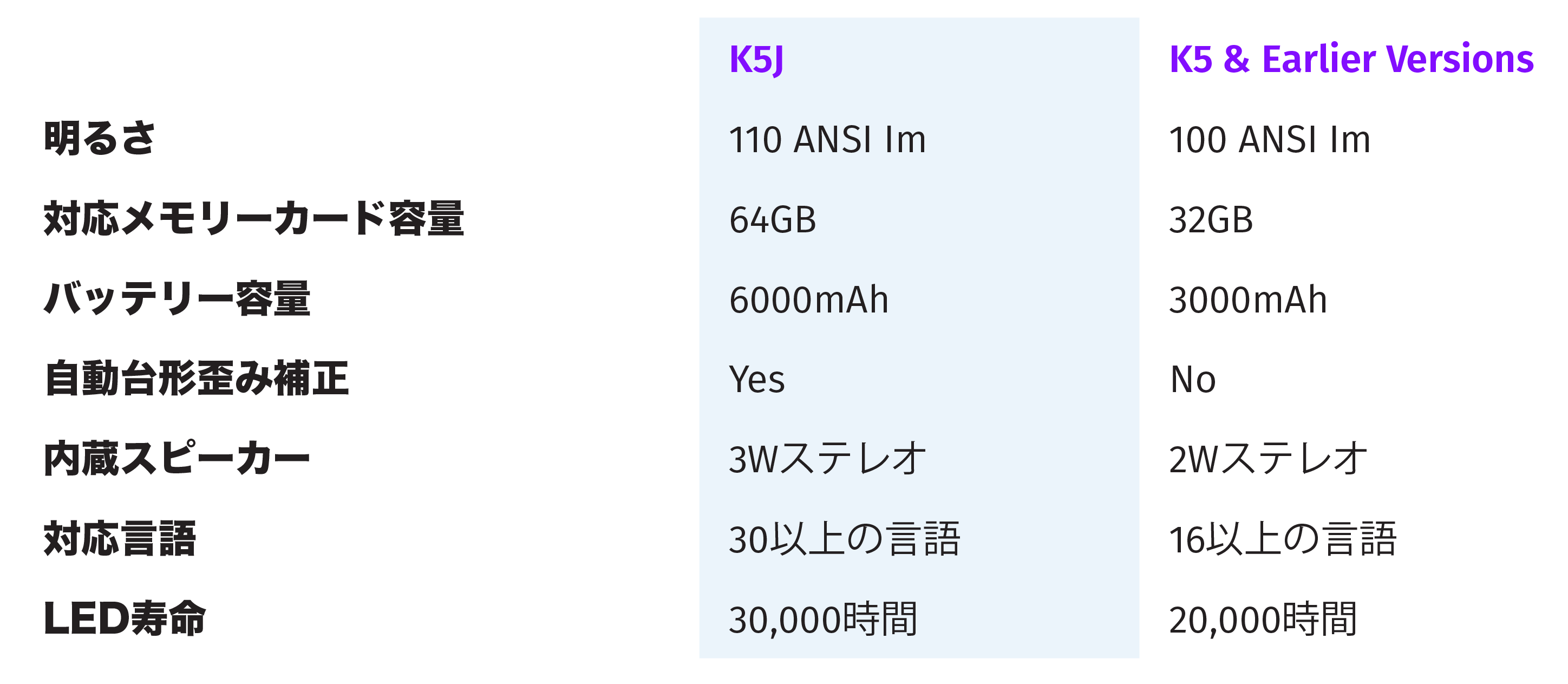 自動台形歪み補正技術を備えるK5Jは、+/-40度以下のあらゆる歪みを1秒以内に自動調整します。この機能により、天井への投影や、あらゆる角度を試しながらの投影が非常に簡単になります。