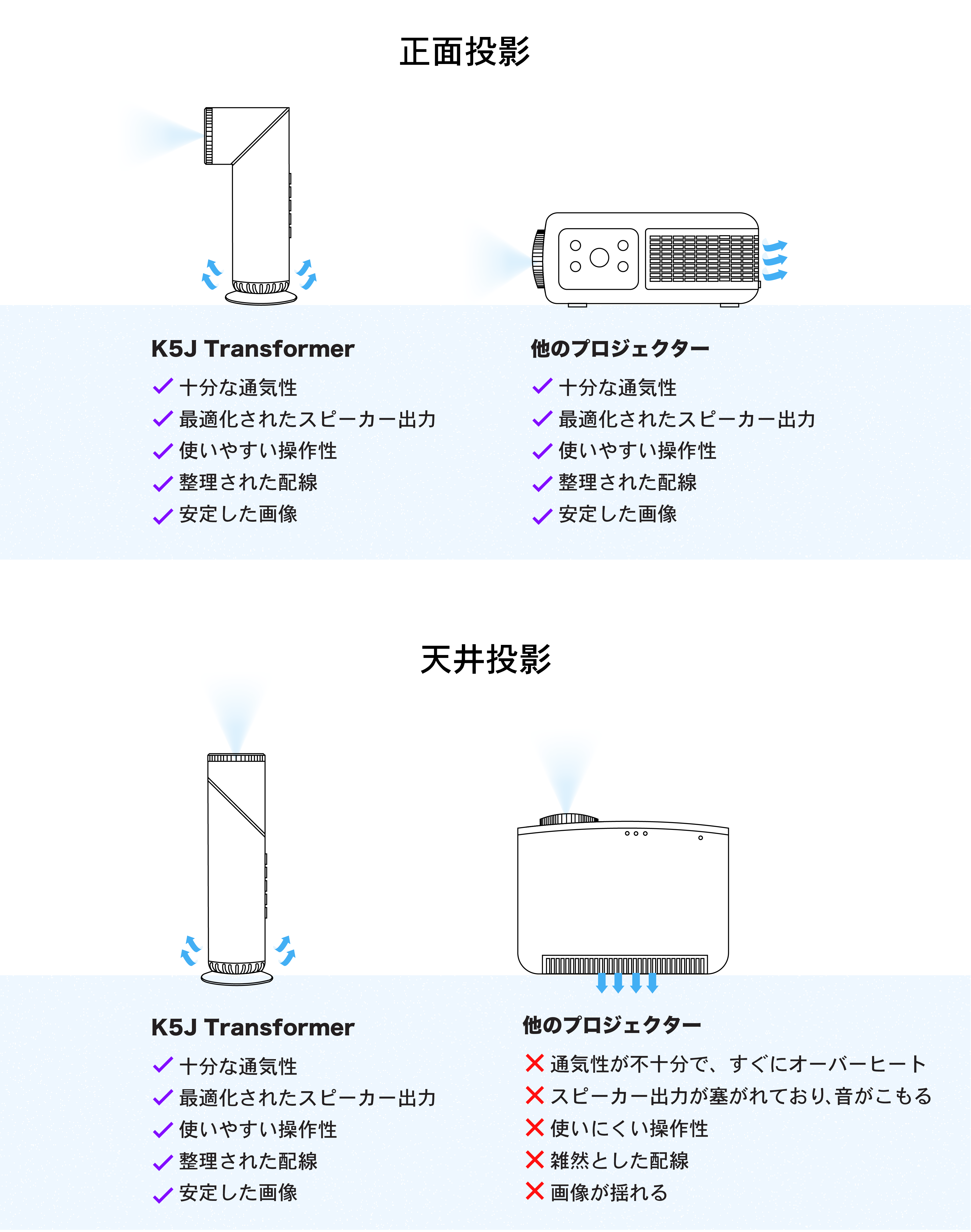 特許取得済みの90度角ローテーション機構が、K5J トランスフォーマーを、位置を変えることなくさまざまな方向での再生が可能な唯一のプロジェクターにしています。