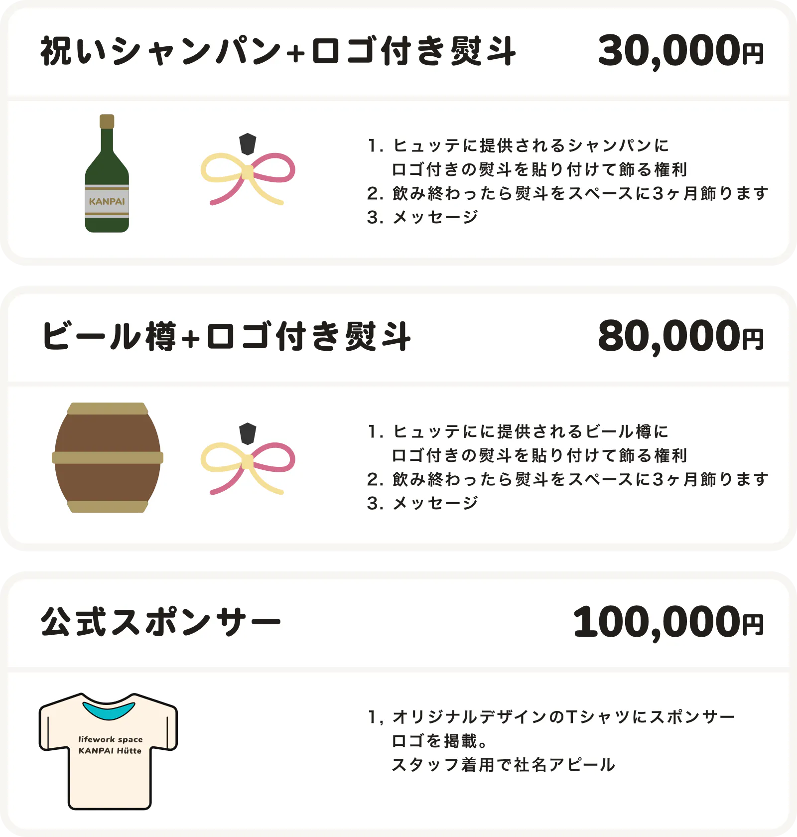カンパイヒュッテを通じて、企業やお名前を広げていきたいかた向け!ロゴを載せたり告知をしていく代わりに、パートナー料・祝い酒代などをいただきます!