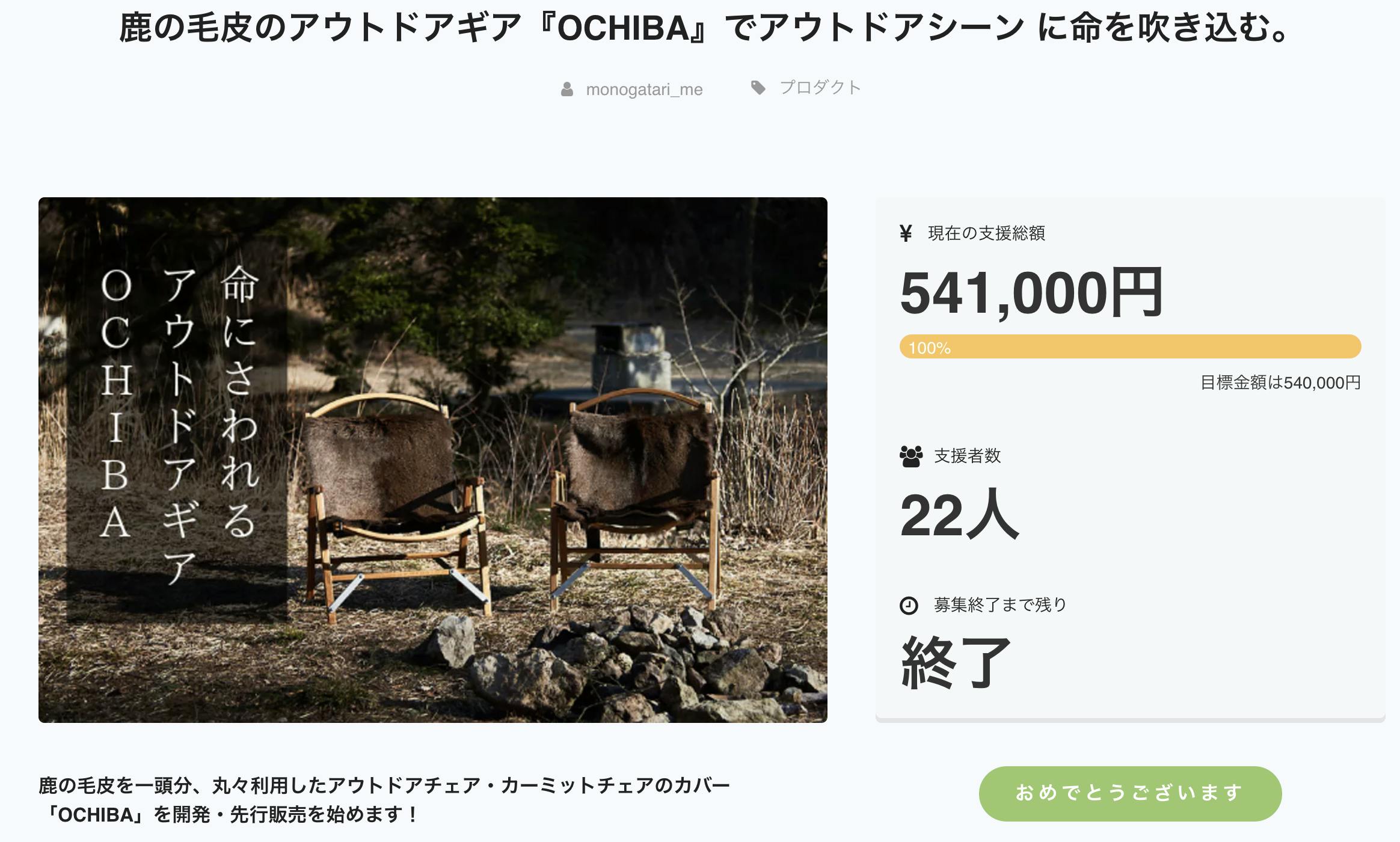 2019/05/31 13:12この度は、鹿の毛皮のアウトドアチェアカバー『OCHIBA』の先行販売を応援していただきまして誠にありがとうございました。昨日、無事目標金額を達成し、募集期間も終了いたしました!今回ご購入いただきました皆様はブランド『物語』の初めての商品を手にとっていただけることとなります。『OCHIBA』を入り口に、今後も様々な商品を作っていきます。どうぞ今後とも末長く応援していただけますと嬉しいです!また、購入していただきました皆様への商品発送に関わる準備は早急に進めさせていただきます。どうかもう少しだけお待ちくださいませ。準備につきましても随時発信させていただきます。楽しみにお待ちください! もっと見る