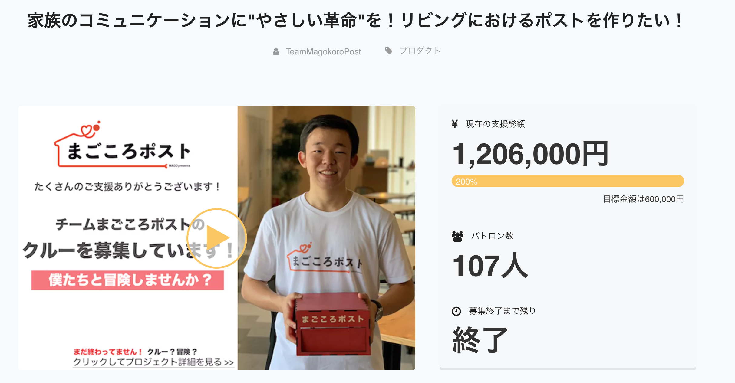 Ryukyufrogs半年間の成果発表の場であるLEAP DAYで、まごころポストを発表し、同時に製品化のためのクラウドファンディングを開始しました。その結果、3時間で目標金額を達成、最終的には200%の資金が集まりました。