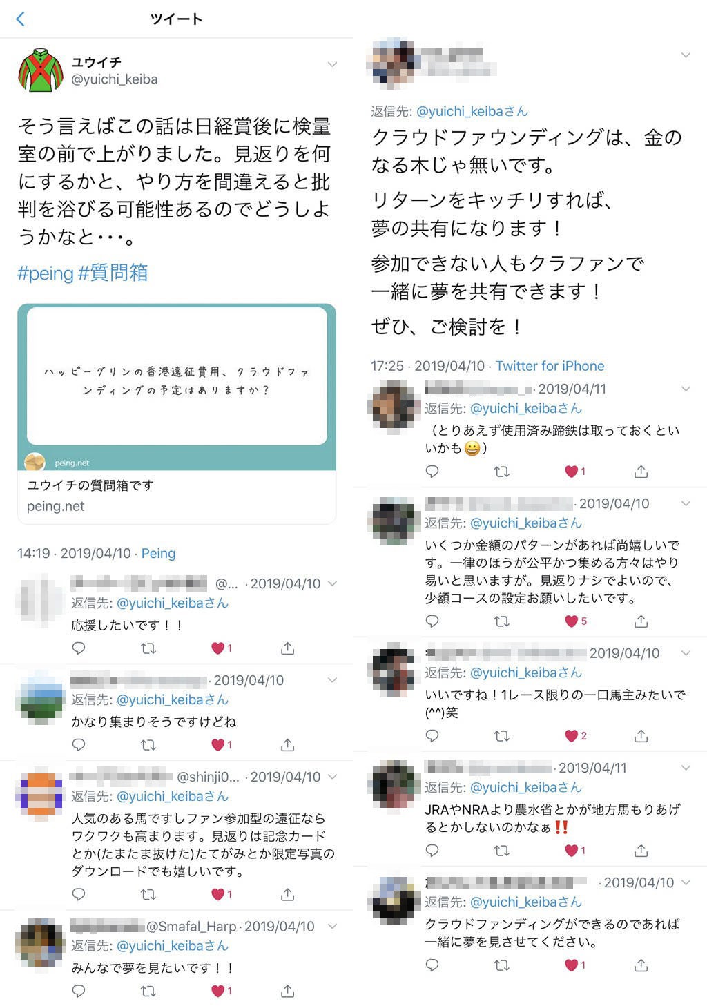 このプロジェクトの話は、twitterでファンの方から質問が来て、実は質問が来る前に関係者間でも一度そういう話になったのですが、別の捉え方をすると自分達が利益を得るために海外のGIへ出走する事と言っているのですからファンの皆様に遠征費用の支援をお願いするのは筋違いで物議を浴びる可能性もありますし、そもそも競馬法にも抵触する可能性がありますから、当然自分達で支払って遠征するつもりでした。