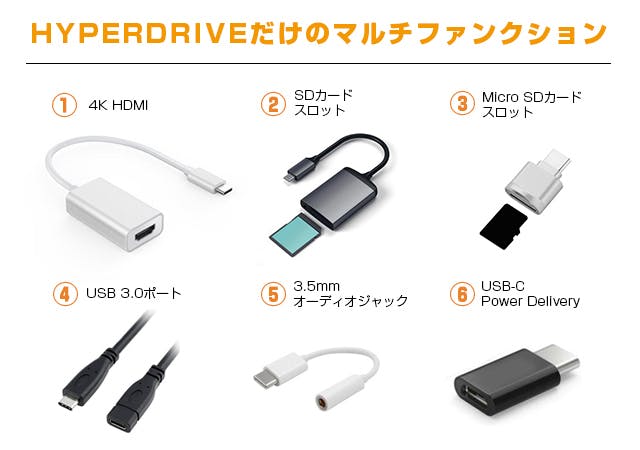 Hyper Drive(ハイパードライブ )の「iPad Pro 2018モデル専用 6in1 USB-C Hub」は、iPad Proに1つしか付いていないUSB-Cポートを6ポート(4K HDMI、USB-C、microSD、 SD、 USB-A 、3.5mmオーディオジャック)に拡張できるアイテムです。