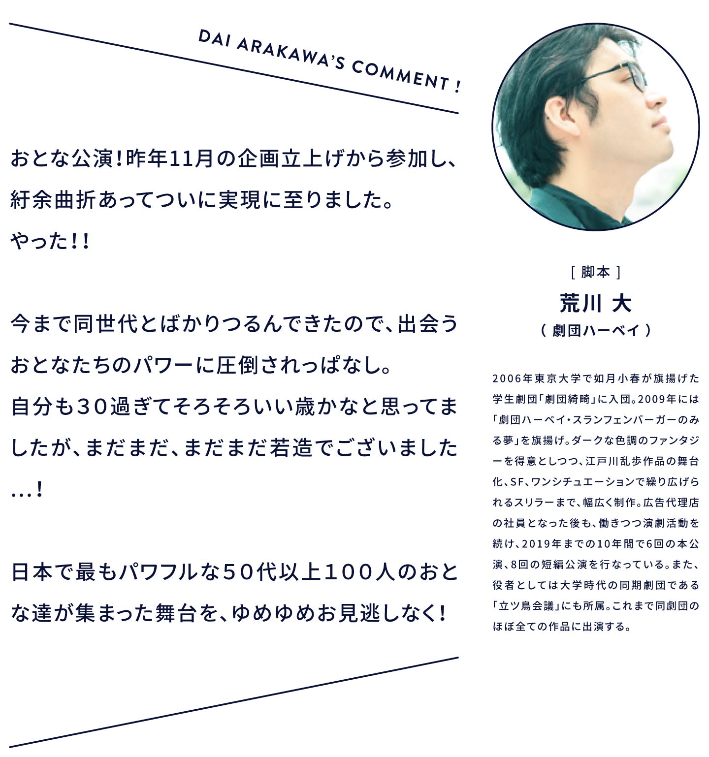 今回、「日本初。全員50歳以上、出演者100人の ” 第1回 おとな公演 ” を9月に実施したい!」と考え、プロジェクトを立ち上げました。