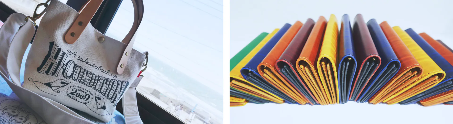 バッグに使用している帆布(はんぷ)は、「富士金梅®」という大阪の繊維メーカーの帆布を使用しています。この帆布は、作りたいものとの相性を考え抜いた上で、数多ある帆布の中から厳選して起用しました。財布やアクセサリーに使用するレザーも最高級の本革を使用しており、必ず1枚1枚現物を確認した上で最大限高品質なものを仕入れるように心がけています。
