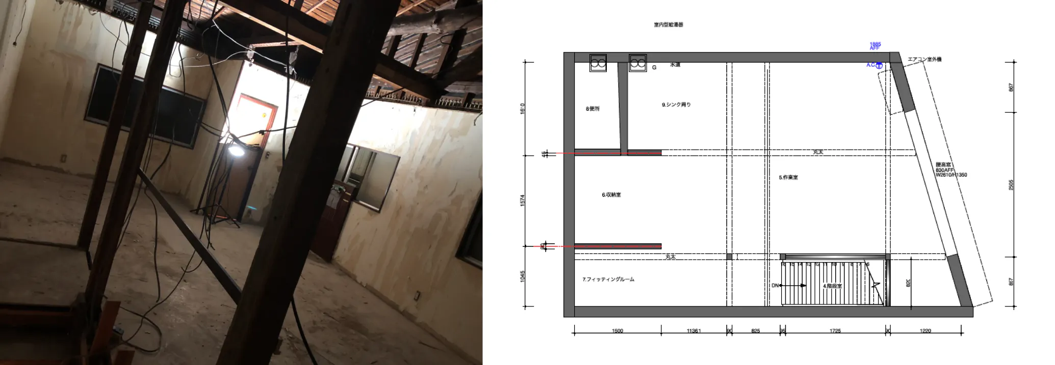 天井板を取り払い、開放感のある広々とした空間にする予定です。ワークショップやイベントの無い日でもコーヒーブレイク等、ご自由にご利用頂ける大きなテーブルを配置し、ワークショップで制作したものやご購入頂いたものをすぐにお試し頂けるフィッティングルームもご用意します。