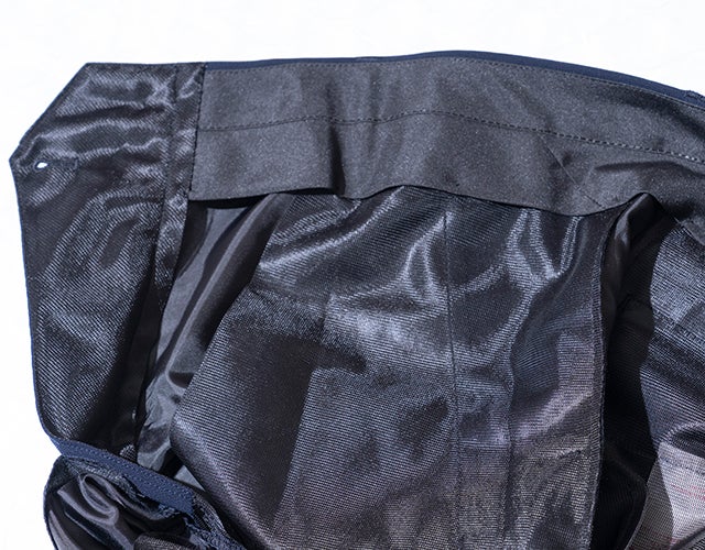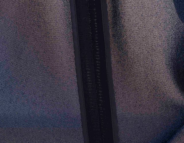 タテヨコに強撚糸の細番手フィラメントを使用した、特殊なカラミ織り素材を使用。