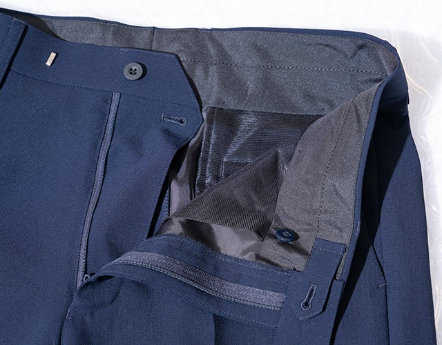 股ぐりの構造を変化させ運動量を増やしているので、通常のスラックス同様見た目の綺麗さはそのままに、そこに抜群の動きやすさをプラスさせたものになっております。
