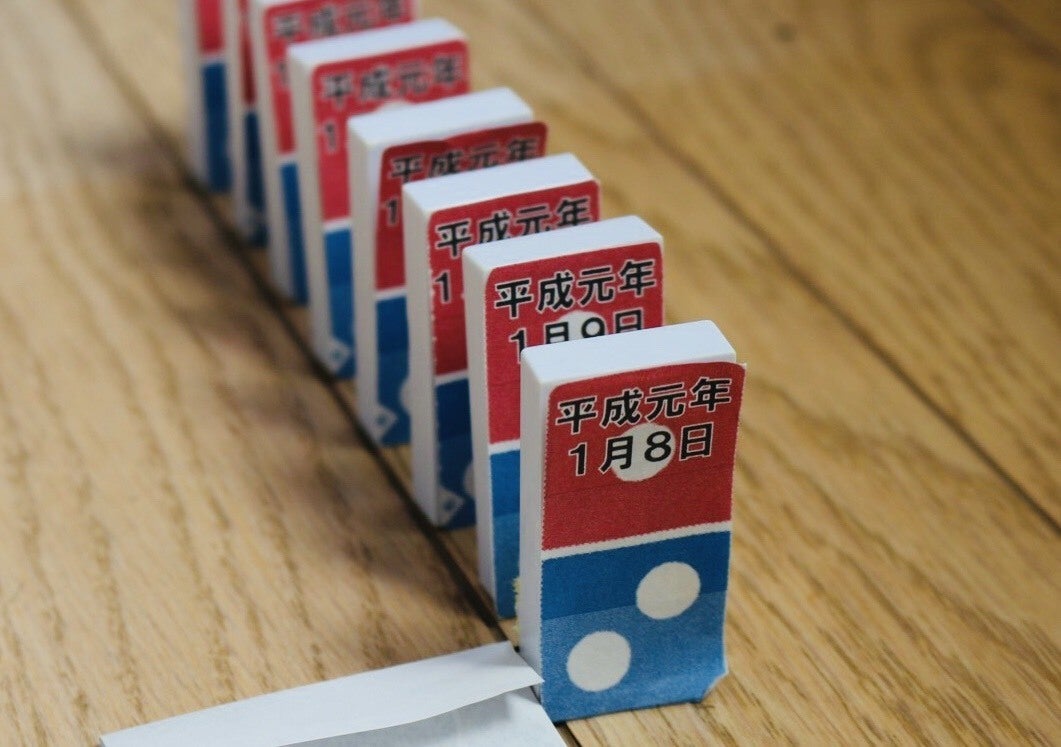 ②ドミノの表面に日付を入れ、「平成元年1月8日」から「平成31年4月30日」のドミノを並べてカウントダウンをするイメージで倒していきます。最後には「令和」の文字が浮かび上がるようなドミノを設置します。