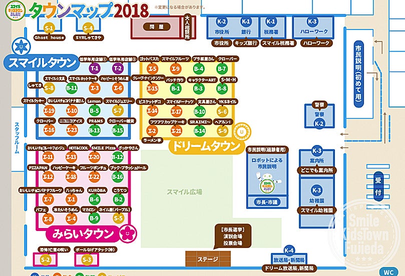 スマイルキッズタウンは職業体験ではありません。スマイルキッズタウンだけの通貨「スマ」を流通させてまちを運営します。こどもたちが創造したお店(飲食・物販・サービス)と、公共(市役所、銀行、税務署、放送局など)で働き、スマを稼ぎます。そして買物やゲームで遊んだりして、スマを使います。税金も納めます。スマが少なくなればハローワークへ行き、仕事を探し、働いてスマを稼ぎます。そしてスマを使う.....