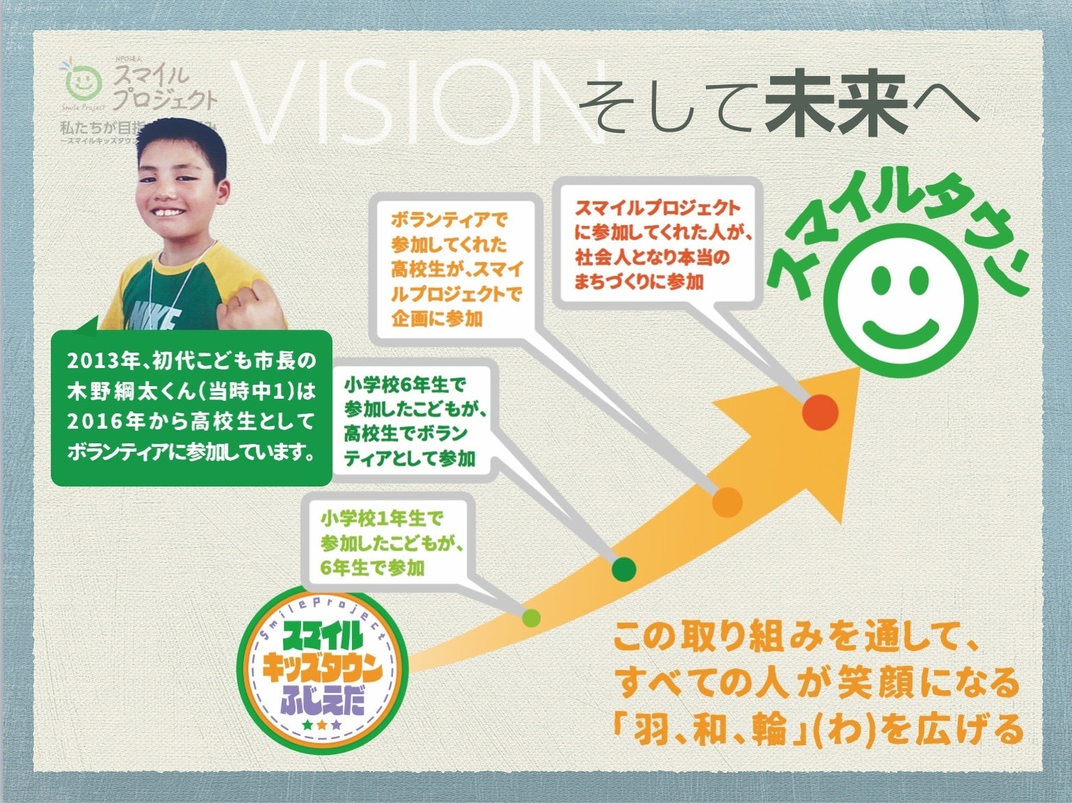 こどもたちの目指す“まち”が、“明るい豊かなまち”であれば、きっと素晴らしい社会になると確信しています。この取り組みを通してすべての人が「笑顔」になることを信じて、今年も多くの「笑顔」と「ワクワクドキドキ」をソウゾウ(想像×創造)して実感したいと思います。