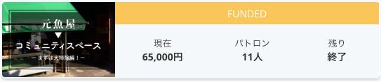 2019/05/27 11:18総支援額 65,000円パトロン 11人達成率 32%にて無事にクラウドファウンディングを終了いたしました!始めた当初は誰も支援してくれないのではないかと不安になっておりましたが、11人もの方々に応援していただき、驚きと感謝の気持ちでいっぱいです!勝手がわからず、初めてしまったため、至らない点が多々あったかと存じますが、この体験を糧にして今後に繋げて参ります。今後もこのプロジェクトは長く続けて行くことが大切だと考えておりますため、皆様からの応援を胸にじっくり続けて参りますので今後ともあたたかく見守っていただけますと幸いです。魚武の最新情報は下記のFacebookアカウントより発信いたしますので、よろしければフォローの程なにとぞよろしくお願いいたします。https://www.facebook.com/uotake2019/リターンにつきましては随時お送りいたしますので今しばらくお待ちください!今後ともなにとぞよろしくお願いいたします!告知:6月29日(土)魚武にてイベント開催いたします!https://www.facebook.com/uotake2019/上記URLより情報を配信いたしますので、ぜひお楽しみに! もっと見る