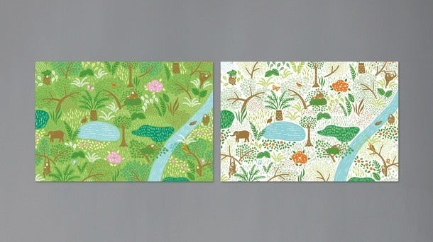 当初は作る予定はありませんでしたが、「そのデザイン素敵!カップ以外の他のものに使ってみては?」とのお声をいただき、縮尺版としてオリジナルポストカードを作りました。再生紙のエコなポストカードです。飾ってよし、メッセージカードとしてもよしのおすすめカードです。