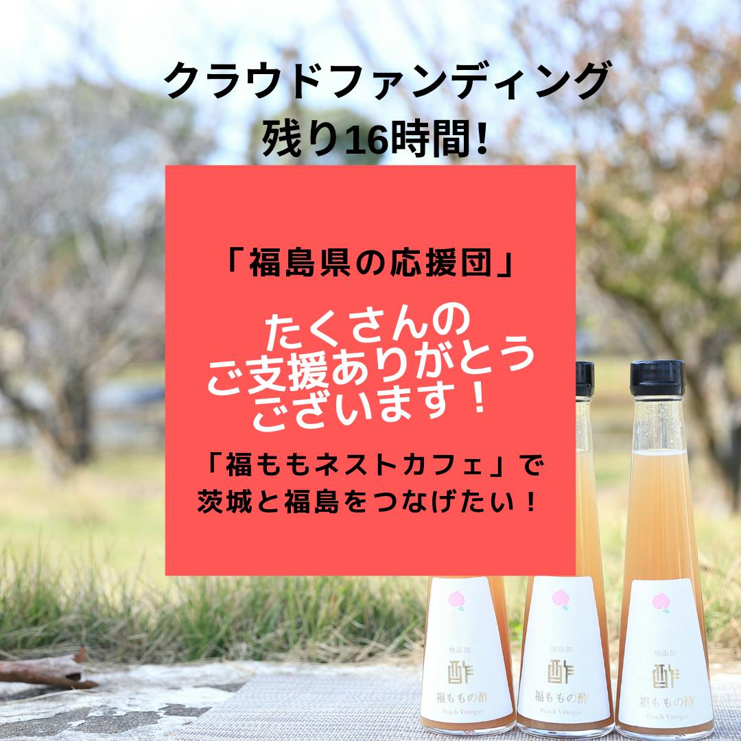 2019/06/26 13:43「福島県の応援団」福ももネストカフェで茨城と福島をつなげたい!「クラウドファンディング終了のお知らせと達成のお礼」//////////////////////////////////////////////////「福ももネストカフェ」プロジェクトのご支援とご声援をいただきありがとうございます!今回、2回目となりますプロジェクトでは、毎日の皆さまの応援に支えられ、昨日をもってネクストステージ1つ目の目標を達成し、終了することができました!皆さまの応援とご声援のおかげで140%、38名の方々のご支援を頂きました。昨年作った「福ももの酢」が商品として完成し、3月に完売してから、今年も、福島と故郷の美味しい「桃」の応援団として継続して行きたい!そして、商品を通じて、頑張っている桑折の方々の活動や桑折町へ行ったことのない全国の方々へ福島の事をもっと知ってもらいたく、福島と茨城を繋ぐアンテナショップの一つとして「福ももネストカフェ」を計画させていただきました。「フルーツビネガーが手軽に飲めるカフェ」で、私の住んでいる土浦市、近隣のつくば市の方にもっと健康になってもらいたいという強い思いで参加させて頂いたクラウドファンディングでした。今回も沢山の方々からの温かいお言葉、応援を頂き、感謝の日々でした。これからも、福島の頑張っている生産者さんや桑折町の一助になれる様に桃のPR活動に努力します。今後とも応援を宜しくお願い致します。皆さまのますますのご健康とご活躍を願い、お礼の言葉とさせて頂きます。本当に有難うございました。 //////////////////////////////////////////////////「福ももの酢プロジェクト」いいね!フォローお願い致します。Instagram:https://www.instagram.com/fukumomo_project/Facebook:https://www.facebook.com/fukumomonosu/ もっと見る