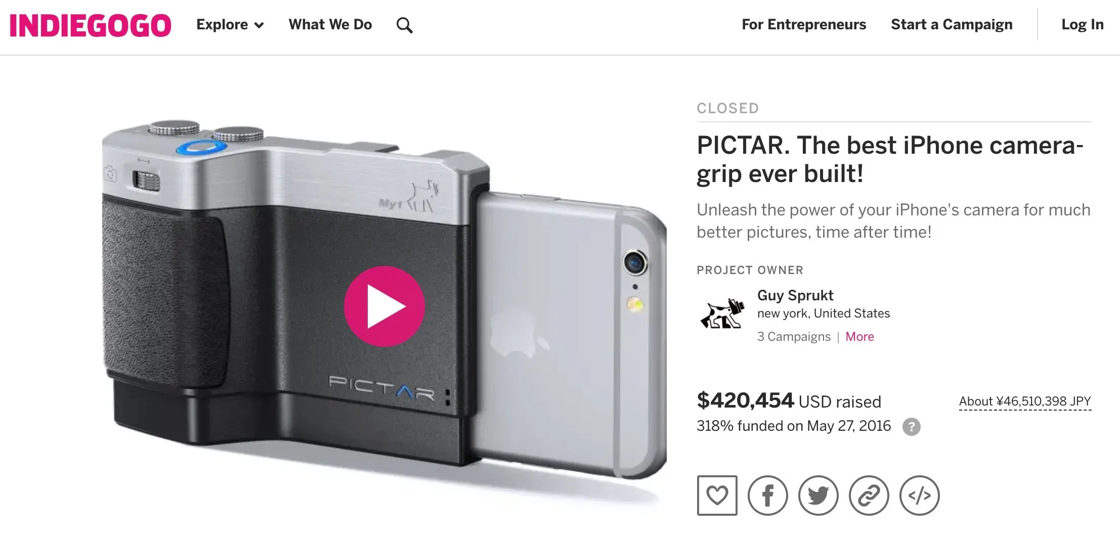 Pictar One 2016 クラウドファンディング結果