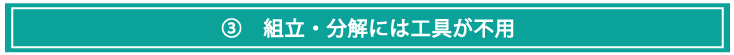 パーツ同士の接合にはビスなどの金物を一切使用していないので、組立には工具が不要です。