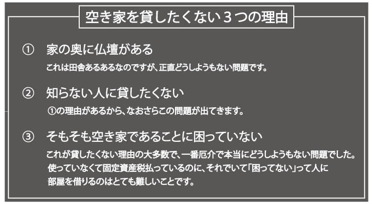 結果、貸してくれる人は全く見つからなかったのですが、そういったことを何軒か繰り返していると、貸したくない理由が分かってきました。