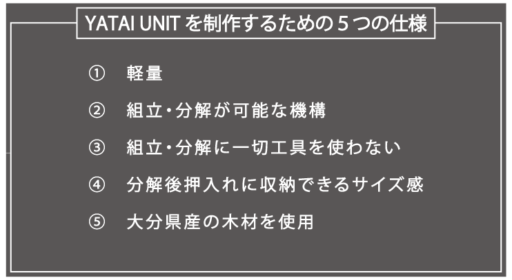 そこで、YATAI UNITの発案者である僕が考えた仕様は以下の5点でした。
