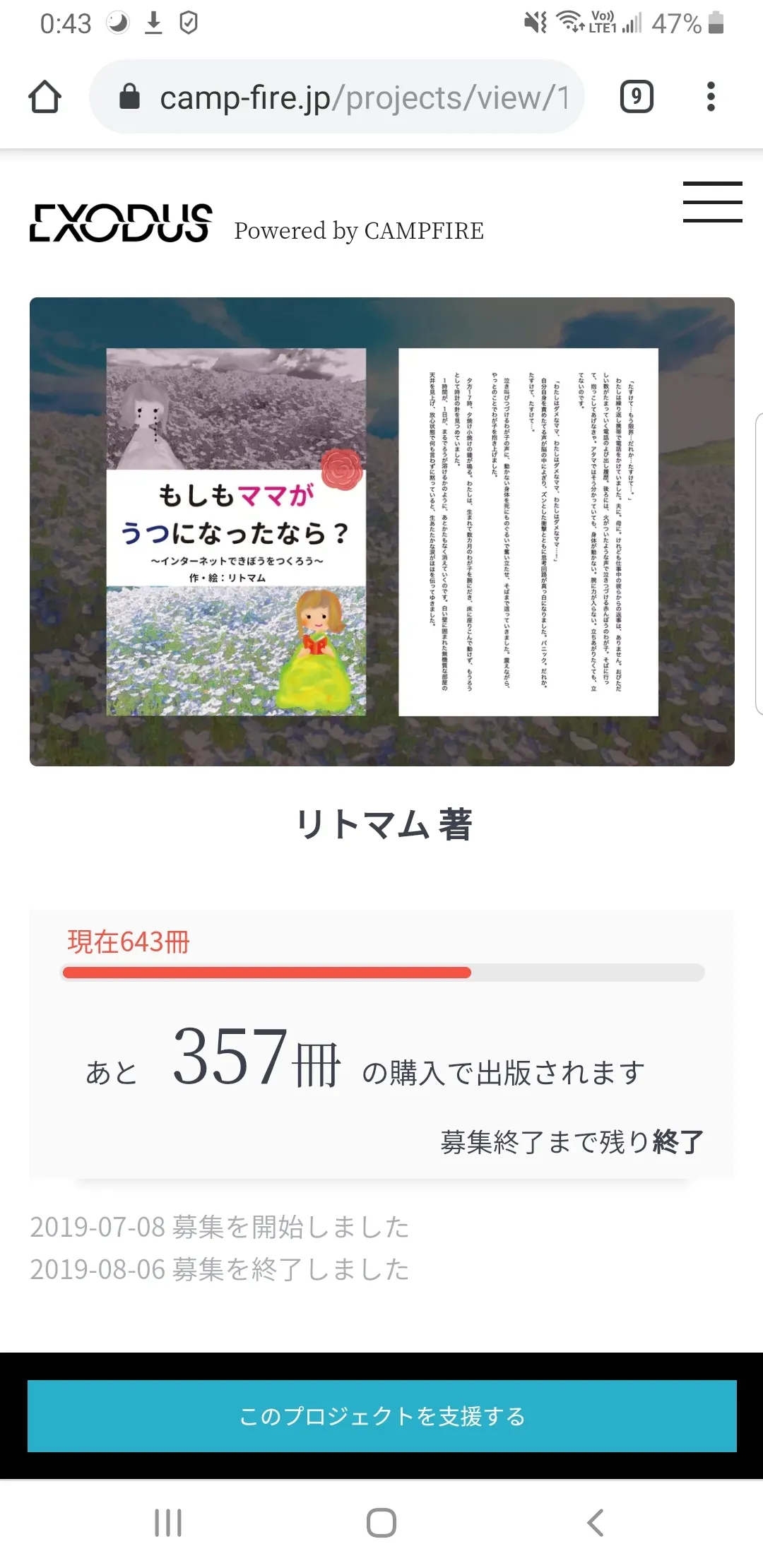 2019/08/10 09:00※ご支援いただいたみなさんへ、大切なお知らせこの度は、去る8/6に終了しました、私のEXODUSクラウドファンディングに、最後まで熱い応援をいただき誠にありがとうございました。結果は643冊と、金額にして160万円余り。あともう一歩及ばない結果となりました。本を心待ちにしていただいた皆さまには、お約束を果たすことができず、まずは心よりおわび申し上げます。しかし、私は今回のEXODUSの経験を活かして、クリエイター活動を今後も継続していきます。私がこの書籍で伝えたかったエッセンスは、こちらのpolcaLifeにその意志を引き続ぐことと致しました。だからこそ、このプロジェクトは、まだ終わりません。また、今後の私の挑戦の構想もいちはやく読めます。実は既に、3つの新しい挑戦の構想を掲げ、一部には既に着手しております。ぜひ、ご覧ください。近々、みなさんに嬉しいお知らせをお届けできることを、願っております。https://polca.jp/users/little_momまた、EXODUSお疲れ様カンパも開催させて頂いておりますが、既にご支援いただいた皆様には、深く御礼申し上げます。こちらでは、500円以上のご支援にて、心を込めたありがとうカードデータをツイッターDMにて贈らせていただきます。楽しみにお待ちくださいませ。https://polca.jp/projects/Nnj1WlSKO12そして最後に。クラファンは終わりましたが、皆さんとの絆は、終わりません。リトマムは今後も、みなさんをワクワク、ドキドキさせられるようなクリエイター活動を継続いたします。この度は誠に、ありがとうございました!今後ともぜひ、宜しくお願い申し上げます!リトマム もっと見る