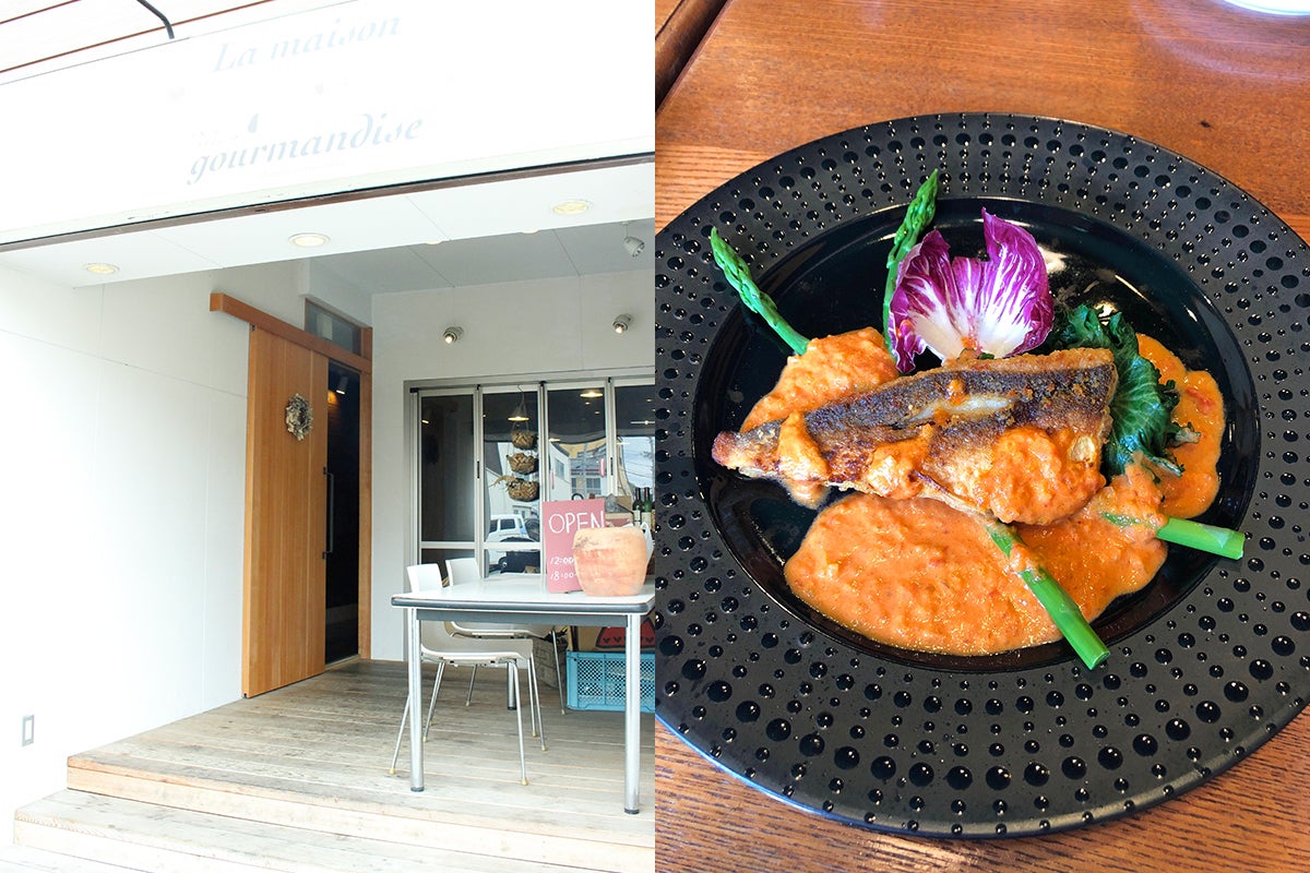 (左:店外観 右:ホウボウのムニエル 塩尻トマトのクリームソース)