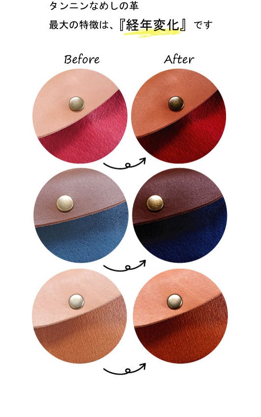 経年変化と一言で言ってもなかなか伝わらないかもしれませんが、具体的に言うと、使い込んだ時間と共に革が柔らかくなり色艶が増してきます。使う人によって、変化の具合は異なり、自分で革製品を育てていく喜びがあります。
