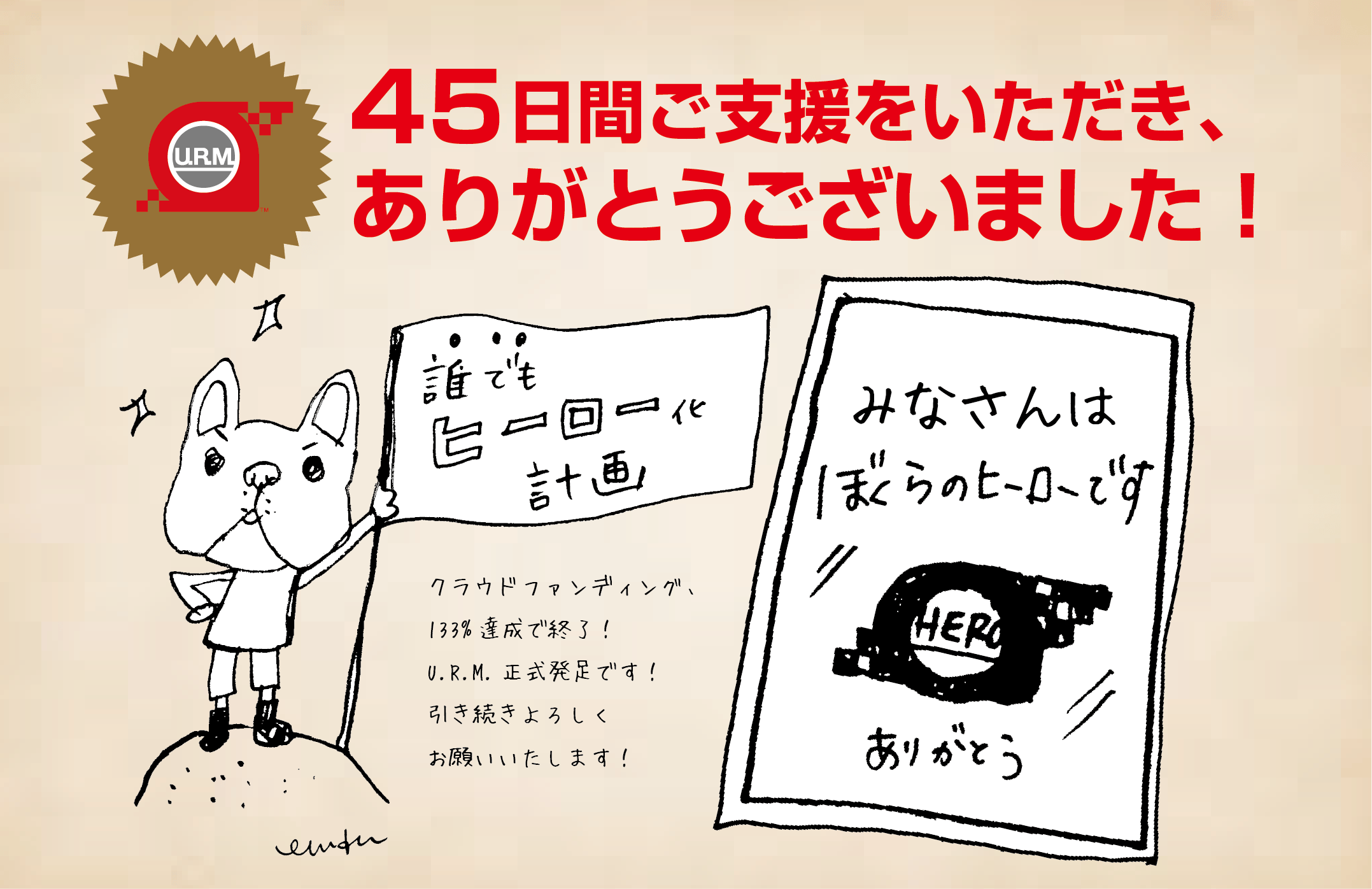 2019/07/10 22:30「誰でもヒーロー化計画」の支援ページをご覧のみなさま、こんばんわ。2019年7月6日(土)を持ちまして、『誰でもヒーロー化計画』〜 小さな社会防衛軍を立ち上げて、まず1,000人のヒーローを生み出したい!〜のクラウドファンディングが終了いたしました。目標支援額500,000円に対して、計667,500円、延べ47名の方にご支援いただきまして、達成率133%で終えることができました。45日間、本当にありがとうございました!期間中にご支援いただきましたみなさん、隊員としてプロジェクトに参画いただきましたみなさん、ご紹介やご案内、SNSのシェア等でご協力いただきましたみなさん、さまざまな場所で貴重なご縁をいただきましたみなさん、みなさんこそが、私にとってのヒーローであり、誇りです。そして、今回のクラウドファンディング達成により、小さな社会防衛軍「U.R.M.」が正式に発足します!引き続きにはなりますが、今後とも末永く、どうぞよろしくお願いいたします!この度は本当にありがとうございました! もっと見る