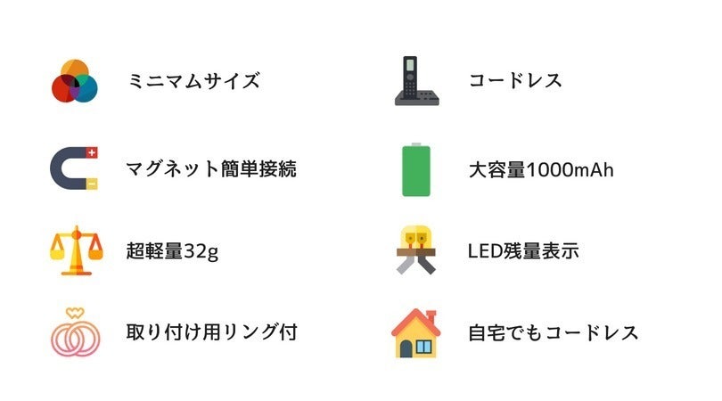 「5,6回の充電が可能・重い・ケーブル必要」よりも、「数十%の充電が可能・軽い・ケーブル不必要」の方が魅力的だと感じる時はないでしょうか?