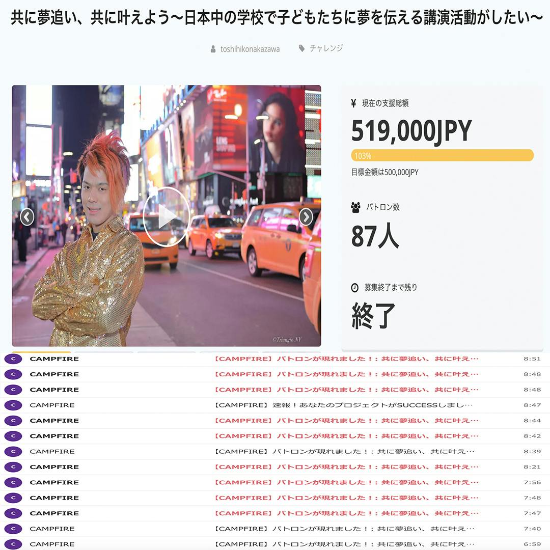 2019/09/11 20:48改めまして、クラウドファンディング目標の103%519000円87名様からのご支援によって達成する事ができました!本当にラスト10分程で達成する事ができました。本当にありがとうございました。その時の模様はフェイスブックでもライブ放送をしたので、1時間半くらいダラダラと話していますが、よろしければご覧くださいませ。https://www.youtube.com/watch?v=67XR7EN2kbY&feature=youtu.be(お忙しい方は、1時間16分辺りから見ると達成した瞬間も見れます!)どなたがご支援したかというのも、頂いたリストが文字化けしていて、なかなか確認できなかったのですが、ようやく確認できましたので、これから少しずつご連絡させて頂こうと思っております。また、キャンプファイヤーの特性上、まだ支援頂いたお金は振り込まれてはいませんが、既に色々このプロジェクトも遂行しながら、同時に学校の方でも働きかけています。今の段階で仮決定しているスケジュールです。小中学校だけではなく、保育園や幼稚園などにも訪問する予定です。おかげさまで、予算の関係によって実施できない可能性を限りなくゼロにしているので、個人的に教育関係者などに連絡して、自分の経験が誰かの為になりそうな場所には、どんどん出向いていく予定です。━━━━━━━━━━━━━━━━━━━━・9/10,17,24坂井東小学校、新通小学校・9/13,20,27坂井輪小学校、木戸小学校・9/25,26南佐渡中学校、新穂中学校・10/1,8,15下山小学校、亀田小学校・10/2三条栄中央小学校・10/4三条第一中学校・10/7燕市吉田中学校 ・10/16燕市の保育園・10/17三条市の保育園・10/19愛知県豊田市旭中学校・11/22~29東京(板橋・国立)、埼玉(坂戸・高坂)の小中学校4校・12/2~6静岡県富士市の小中学校2校━━━━━━━━━━━━━━━━━━━━何か偉業を成し遂げ、世間で言われる『成功した人』のお話は、生きていく上で大きな指針となる情報や技術を得る事ができる。しかしながら、もしかしたらそれは今みなさんの手のひらにある、スマホで学べる事かもしれない。テレビやメディアであまり見る事のない『多くの人が知らないかもしれない人』のお話は、未完成かもしれないけど、それは想いになり、オンラインでは感じられない情熱を伝えられるかもしれない。それは決してみなさんの手のひらの上だけでは感じられないものになるはず。僕もこのような活動をしている中で、一番尊いのは、「現役」である事だと信じています。だからこそ、引退してからお話をするのではなくて、今その瞬間でしか語る事のできない、同じように自分の未来に向けて挑戦している人のお話が、一番心に響く。少なくとも僕はそう。だから直接会いに行って、触れられる距離感で踊り、話して、表現する。その距離感こそが、子ども達、いや我々にとっても、手を伸ばせば届く何かだと思うから。最初で最後の人生、まだ見ぬ世界を一緒に見に行きたい。またこちらでも色々ご報告させてください。改めまして、本当にありがとうございました。みなさまのご支援を必ず次の世代へ伝えて参ります。リターンのカレンダーも届きました!!10月の下旬には皆さまの所へお届けできるように配送致します!中澤利彦 もっと見る