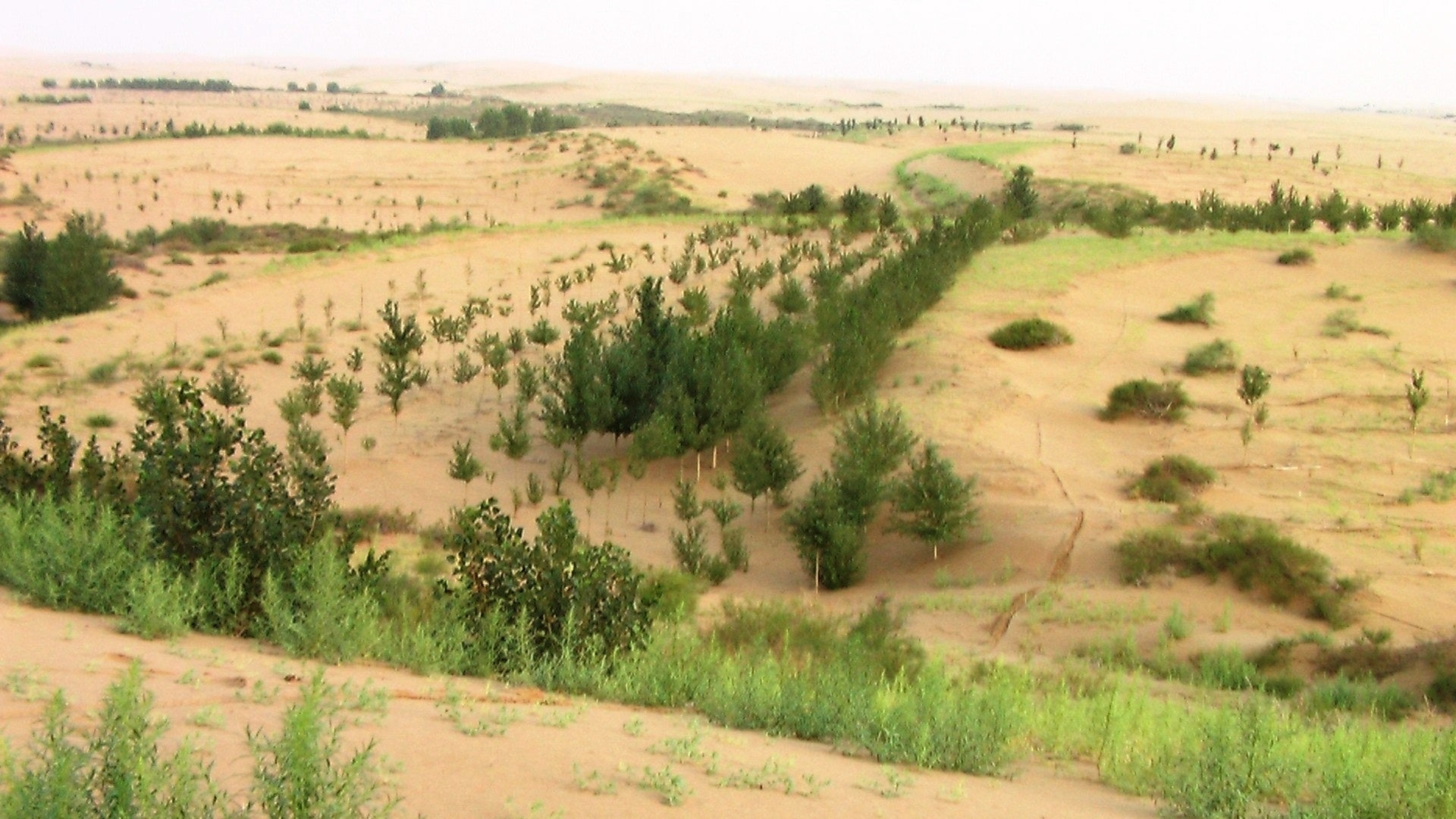 そしてこれが2年目に同じ場所から撮った写真です。人間が植えた木が立派に育っています。それより一番驚いたのが植えた木を風よけにして自然と草が生えてきていいることです。これを見たとき「ここは何千年の前から砂漠だったわけではなく、ここ数十年の単位で砂漠化してしまった土地だ、砂漠と砂漠化した土地は違う。砂漠化した土地は元の緑に戻すことができる」そう確信しました。