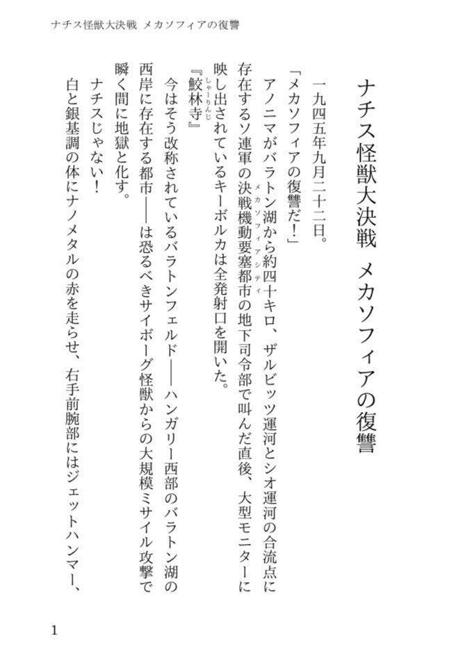 今回は当サークルがコミックマーケット97にて頒布を予定している全年齢向け小説同人誌『続・ナチス怪獣大決戦 メカナチスの復讐』の製作費、500,000円のご支援をお願いできないかご相談させて頂けないかと思い、クラウドファンディングの企画を立ち上げました。