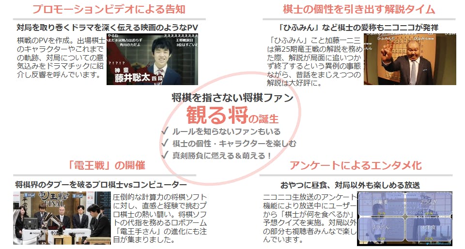 将棋が強くなくても将棋が楽しめるような番組づくりに取り組み、棋士個人への興味関心を集めるような企画をたてることで、普段将棋を指さなくても、対局を観戦する「観る将」という言葉が生まれ、niconico独自の将棋文化となっています。