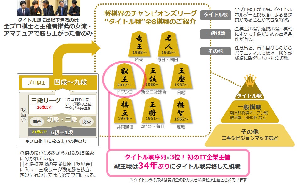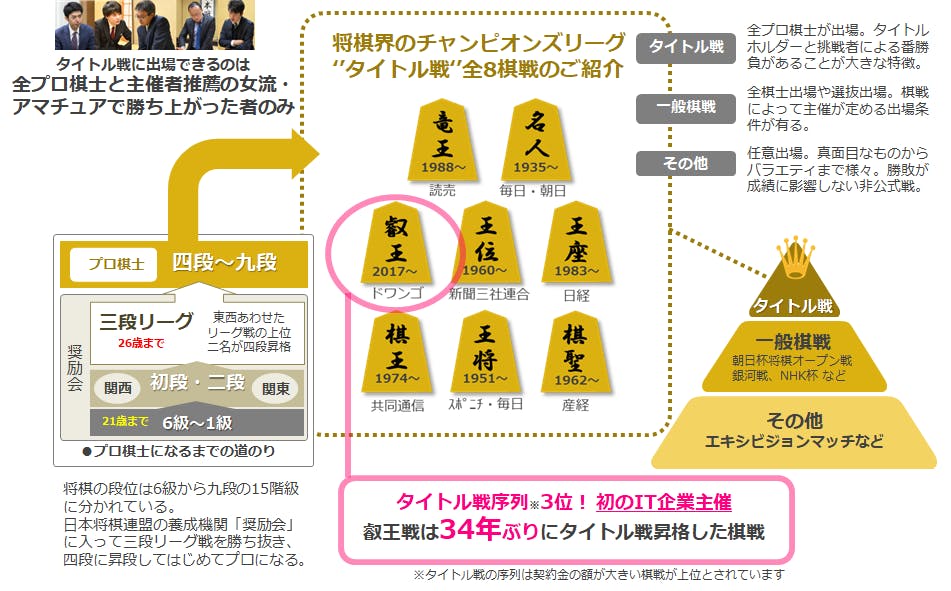 これまでのタイトル7棋戦は新聞社の主催で行われていたため、「叡王戦」はIT企業が主催する初めてのタイトル戦となりました。