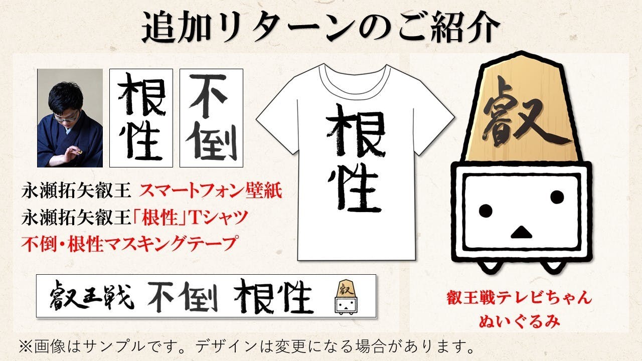 2019/06/14 18:10いよいよ、募集終了まで残り6時間となりました。皆様に本プロジェクトをご支援いただき、おかげさまで500%以上の達成率となりました。ご支援いただきました皆様、誠にありがとうございます。募集終了に向けて、ストレッチゴールをお知らせさせていただきます。本プロジェクトの終了までに、ご支援が700%を達成しましたら、ご支援いただいた皆様に第5期叡王戦七番勝負のポスターデータをプレゼントさせていただきます。データは、お一人様1点のプレゼント提供となります。※第5期叡王戦七番勝負への挑戦者決定後にポスターを制作しますので、データの送信は2020年4月頃を予定しております。※ポスター画像について、当社の事前の承諾なく、第三者への譲渡及び転売は禁止させていただきます。参考:第4期叡王戦七番勝負ポスターデザイン もっと見る