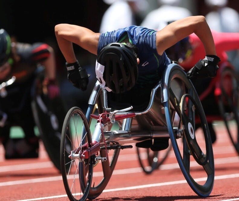 一度は半ば諦める気持ちになりましたが、身体に障がいを持つ前に行っていた自転車競技を思い出して「自転車競技=走る=陸上競技」というイメージが頭の中で出来上がっていた頃、車いすマラソンに誘って頂いたのがきっかけとなり陸上競技を始めました。