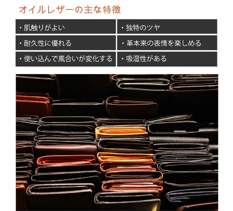 タンニンなめしを施す際に、オイルを染み込ませた革はオイルレザーと言います。オイルレザーは革の強度を保ちながら、しっとりとした心地いい肌触りが楽しめます。また、たっぷりのオイルを染み込ませているので、艶やかな上品な光沢があり、しなやかで耐久性もあります。