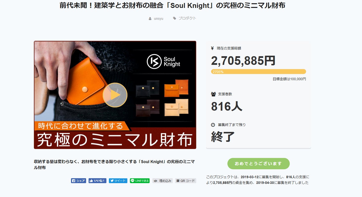 Soul Knight社第2弾『UltraThinシリーズ』、2019年4月に816人の支援者より2,705,885円で終了したプロジェクト、【前代未聞!建築学とお財布の融合「Soul Knight」の究極のミニマル財布】 https://camp-fire.jp/projects/view/136782 から開発されます。