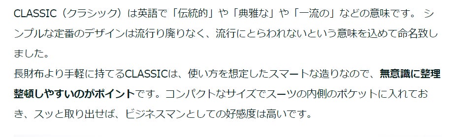 CLASSICの重さはわずか43gで厚さは1cm未満。ジーンズのポケットなどに長時間入れていてもストレスを感じません。お尻のポケットから片手でサッと出せる動線の良さは魅力的です。