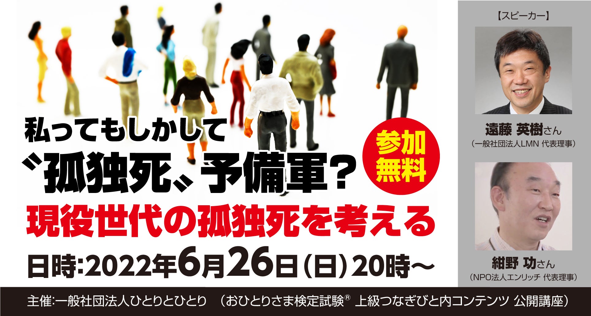 2022/06/13 11:52無沙汰しておりますの方も、そうで無い方もこんにちはひとりとひとりの廣川です以前は、私たちの作った「しるしるみじる」を支援いただきありがとうございました。この度「孤独死」にかんする無料のイベントを開催します。今回のテーマは「現役世代の孤独死」です。【イベントのお知らせ】「私ってもしかして〝孤独死〟予備軍?」現役世代の孤独死を考える開催日時:2022年6月26日日曜日 20:00(zoom)参加無料▼申し込み、詳細はこちらhttps://hitoken20220626.peatix.com/viewいやいや、孤独死って「独居高齢者の問題でしょ?」といった感情を抱く方は多いのかもしれません。私は高齢でもないし、仕事もしていて社会的に孤立だってしていないから大丈夫。そうは思っても…単身世帯が増え、コロナ禍のリモートワーク…「今日は誰とも話をしなかったなぁ」なんていう方も多いのでは?実は「孤独死」の4割はなんと現役世代、平均年齢は60代前半なんです。こういった事実を聞きば、まったく無関係な話ではないようにも思えます。このイベントでは、「現役世代の孤独死」てどういうことなの?をつまびらかにしながら、日本の現実を知り、「現役世代の孤独死」について当事者・支援者として何ができるのかをスピーカーを含めた、このイベントに参加するすべての方々と共に考え、模索していきたいと思います。【スピーカー】NHK:所さん!事件ですよ「どうする!?現役世代の孤独死」(2022年6月9日放送分)クローズアップ現代+「親を捨ててもいいですか? 虐待・束縛をこえて」(2021年5月6日放送分)などに出演された、シニアライフ特化型コンシェルジュサービス 一般社団法人LMNの代表理事 遠藤英樹さん。51歳の実弟を孤独死で失った経験からNPO法人を設立。LINEによる見守りサービスを提供されている特定非営利活動法人エンリッチ代表理事 紺野 功さんです。☆こんな人におすすめ!・「孤独死」なんて、独居高齢者の問題でしょ? と思う人・「孤独死」するのは自己責任じゃないの? と思う人・「孤独死」ってなに? と思う人・「孤独死」なんて考えたこともない、という人・「孤独死」におびえている、可能性を感じている、という人・当事者意識のある人も、そうでない人も大歓迎です!みなさまのご参加おまちしております▼申し込み、詳細はこちらhttps://hitoken20220626.peatix.com/view もっと見る