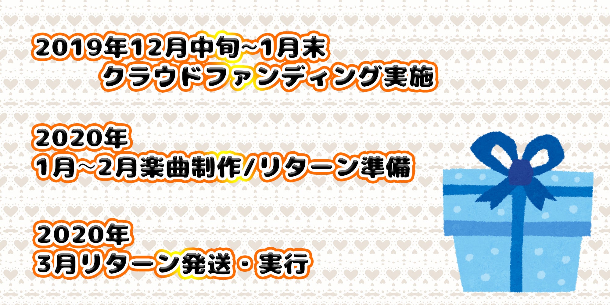 2020/03/15 23:20【クラウドファンディング/リターングッズお知らせ】 全リターングッズの発注が完了致しました!!! どんな出来上がりになっているのか…お楽しみに!!! もっと見るリターングッズ/オリジナルミュージックカードに関する情報