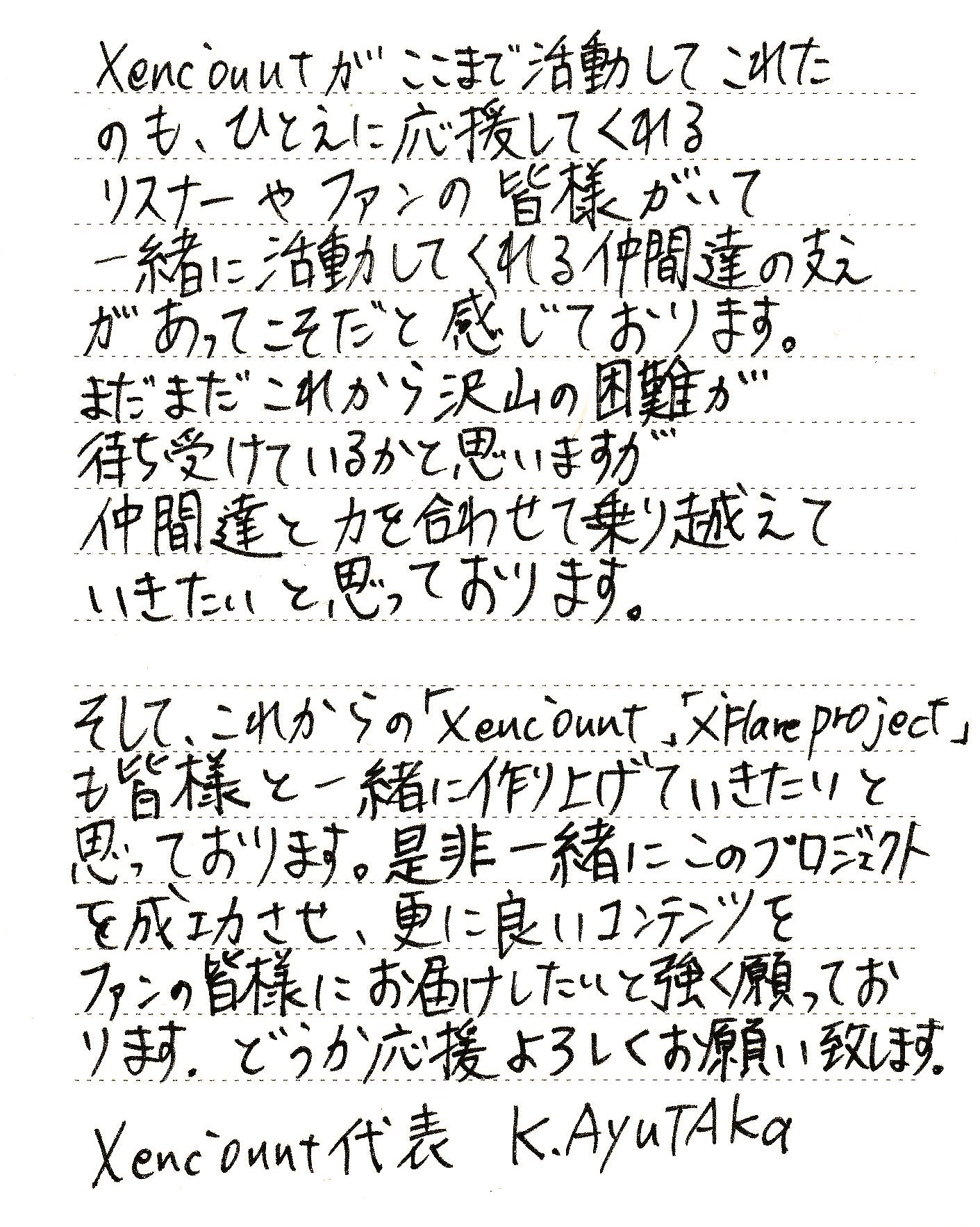 同人音楽サークル X enc'ount (クロスエンカウント) 代表の K.AyuTAka (略称:あゆたか) です。