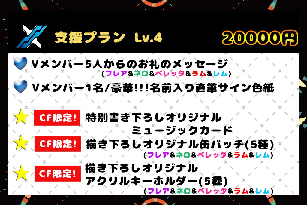 2020/04/08 18:18【X enc'ount】VTuber応援! Level UP project!!▽ご支援くださいました148名のパトロンの皆様改めて心よりお礼申し上げます!!!ご支援のおかげでメンバーたちのLiVE2D活動に向けた準備を着々と進めております今回ご支援いただいたご支援金の明細をまとめさせていただきました!!!こちらの内容で使用させていただきましたことをご確認いただけたら幸いでございます!!!企業V様のように皆様に毎日楽しんでもらうことは難しいかもしれませんが全メンバーこれからもそれぞれのペースで一生懸命頑張っていきますのでこれからも「X enc'ount」を含め何卒宜しくお願い申し上げますX enc'ount一同より もっと見る【クラウドファンディング/リターングッズお知らせ】