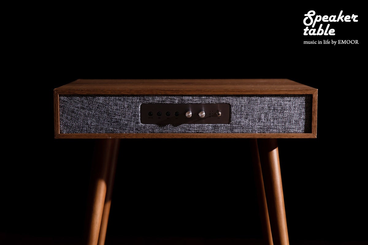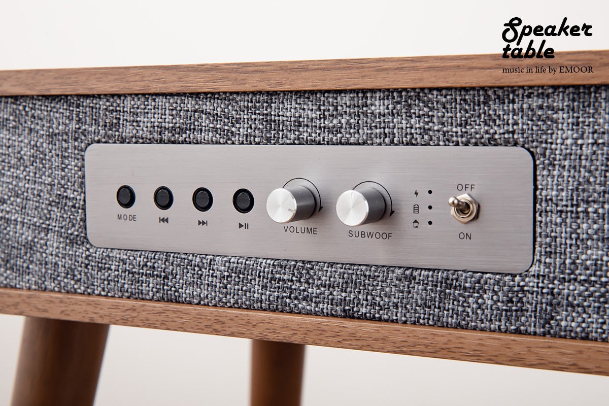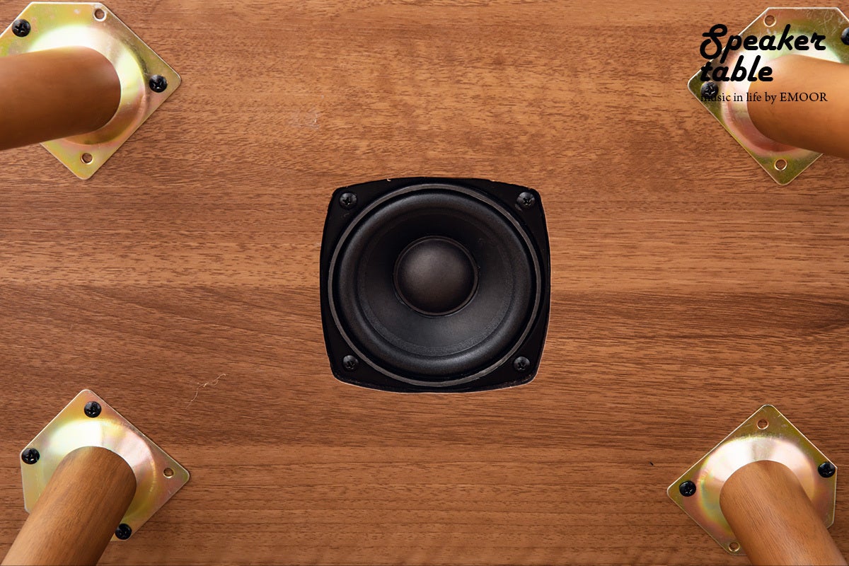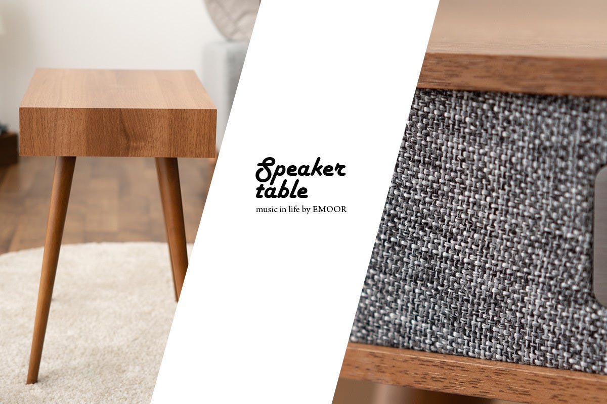 CAMPFIRE限定の先行発売となるSPEAKER TABLEはその名の通り、2.1ch(ウーファー付)スピーカーと、木とファブリックで構成したテーブルを一体化した、デザインインテリアです。あえてアナログなインターフェースを採用し、木の温もりとファブリックを合わせたテーブルとの一体感を志向しました。