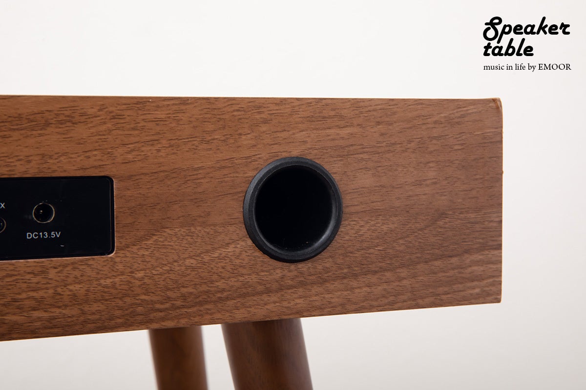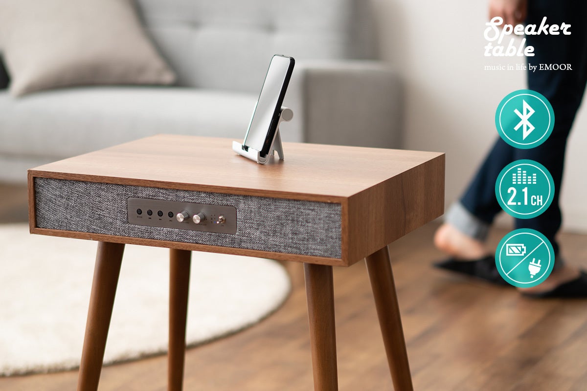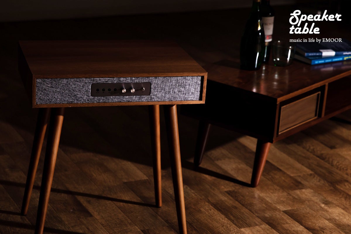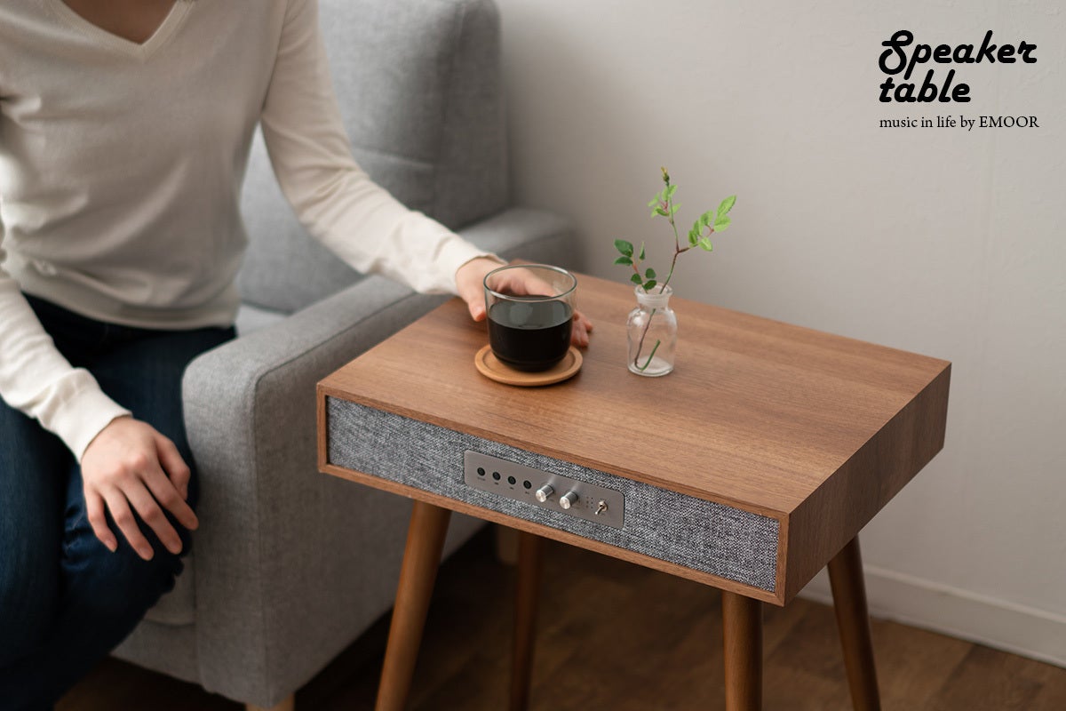 CAMPFIRE限定の先行発売となるSPEAKER TABLEはその名の通り、2.1ch(ウーファー付)スピーカーと、木とファブリックで構成したテーブルを一体化した、デザインインテリアです。あえてアナログなインターフェースを採用し、木の温もりとファブリックを合わせたテーブルとの一体感を志向しました。