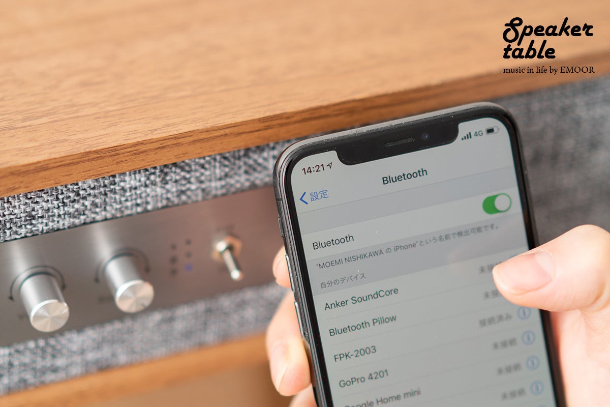 A.スピーカーテーブルの電源をONにし、お手元のスマートフォンや音楽プレイヤー、PCなどからBluetooth接続をしてください。