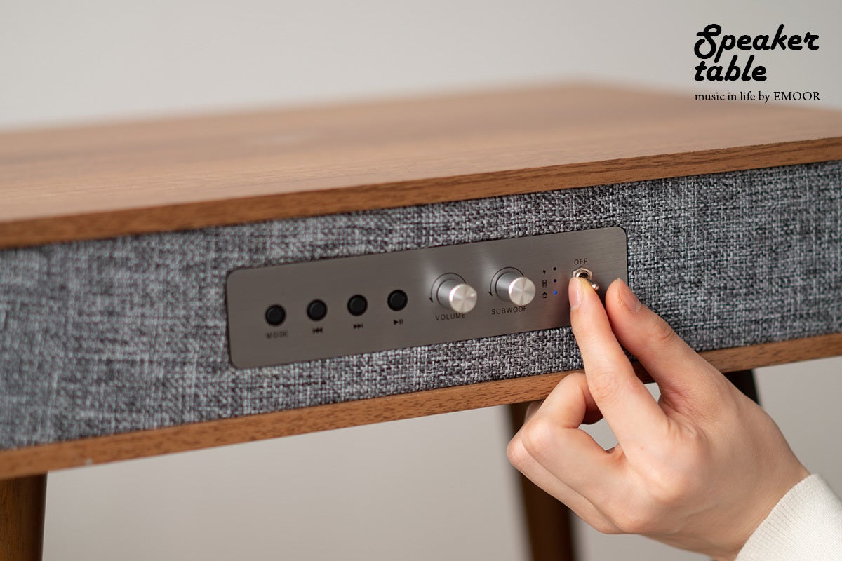 ON/OFFスイッチにボリュームノブは、レコード世代には懐かしい、あえてアナログなデザインを採用。ウッド&ファブリックのシンプルなデザインのテーブルに、スピーカーらしさを加えた先進的なデザインです。